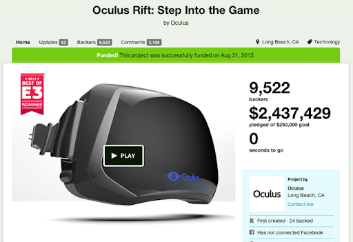 Oculus VR: Twelve years ago, the company collected $2.5 million on Kickstarter to create virtual reality headsets, significantly exceeding its $250,000 goal. Meta (previously Facebook) bought the company for $2.3 billion in 2014.